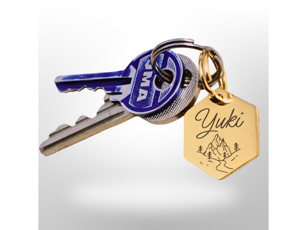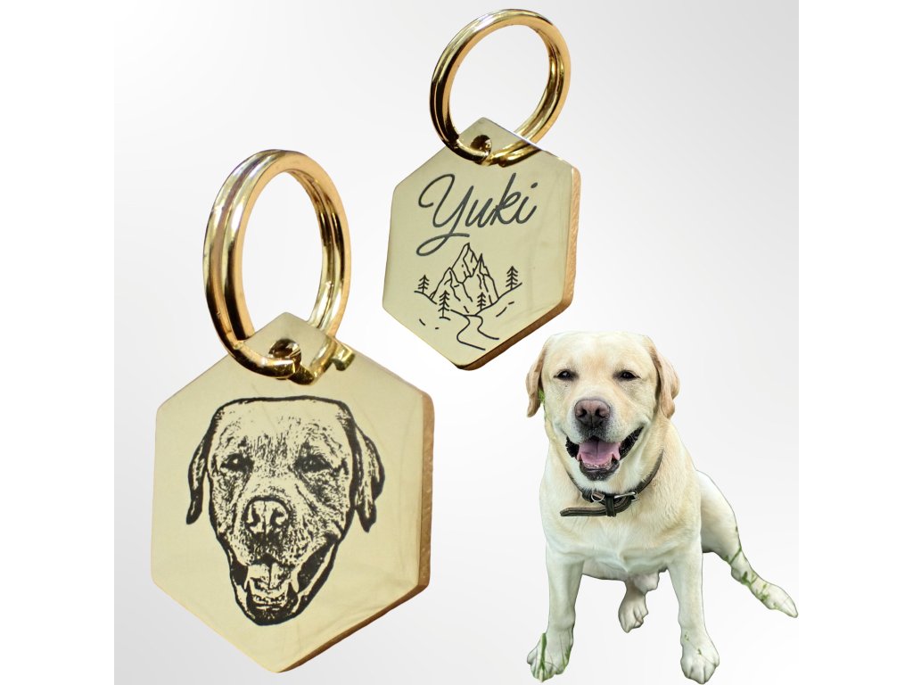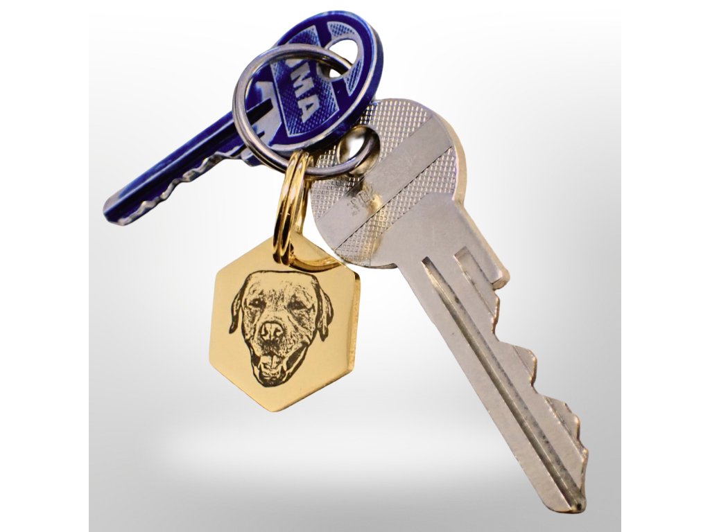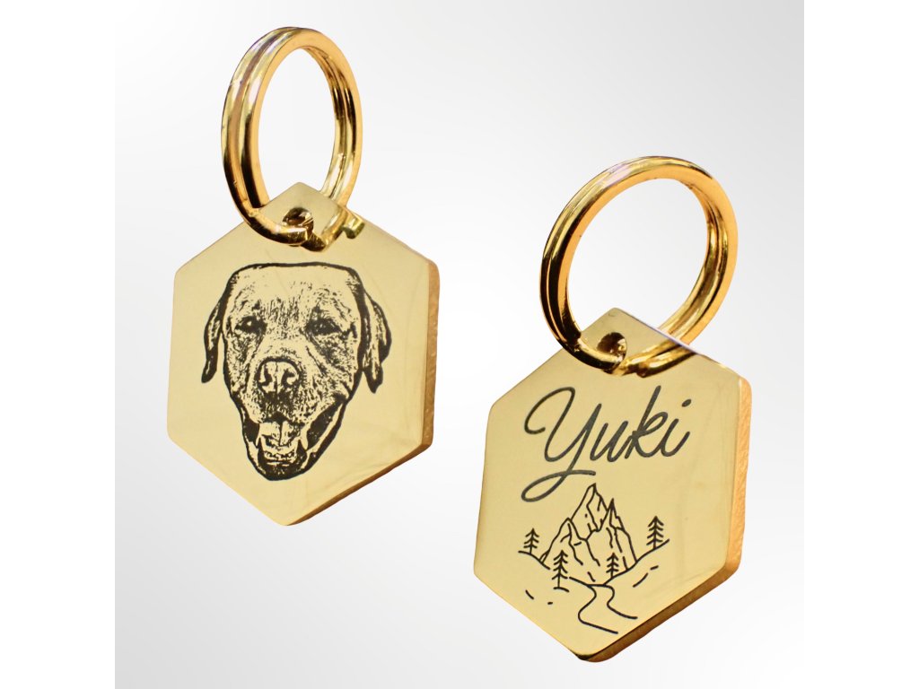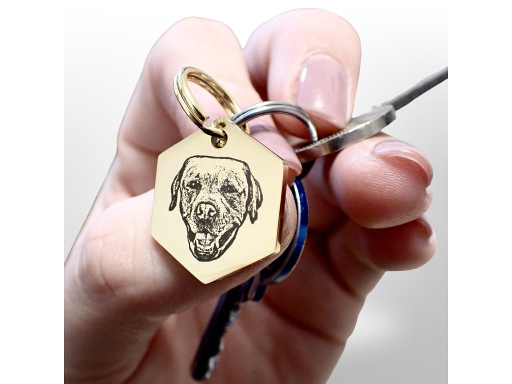 Přívěšek na klíče s portrétem hlavy domácího mazlíčka - zlatý šestiúhelník