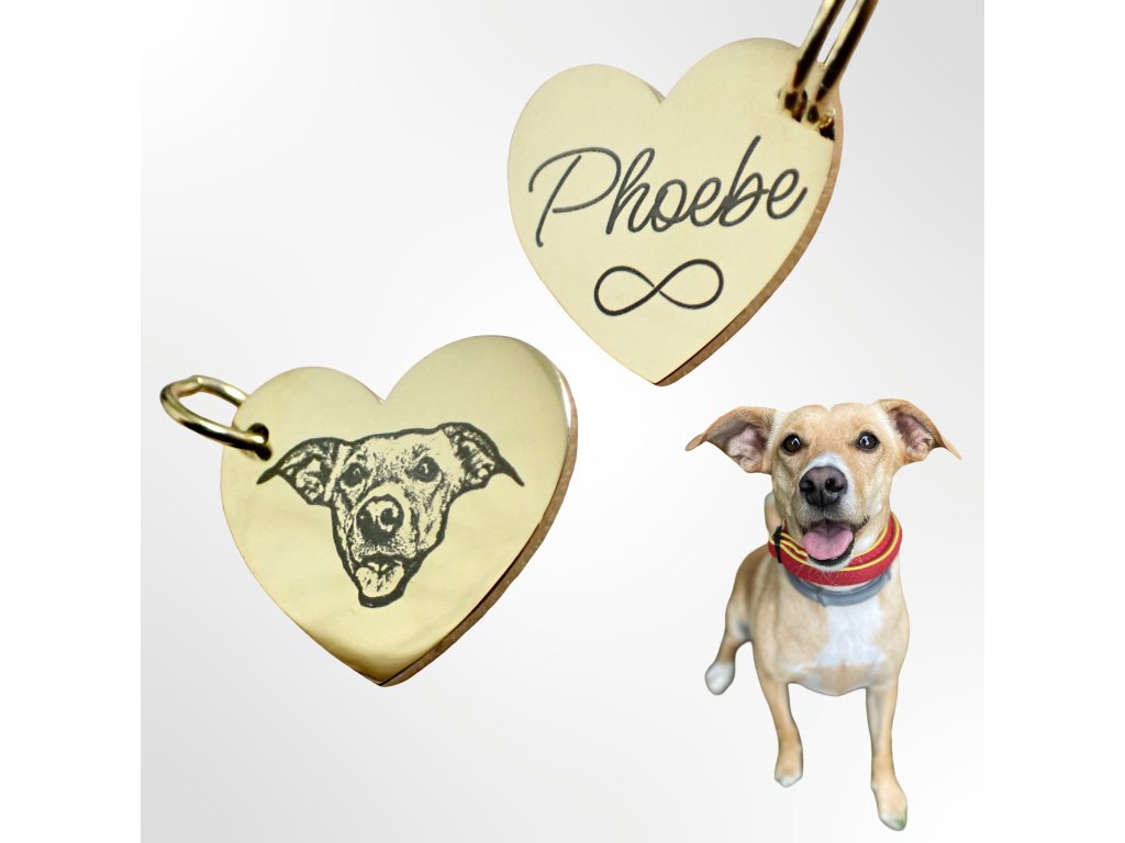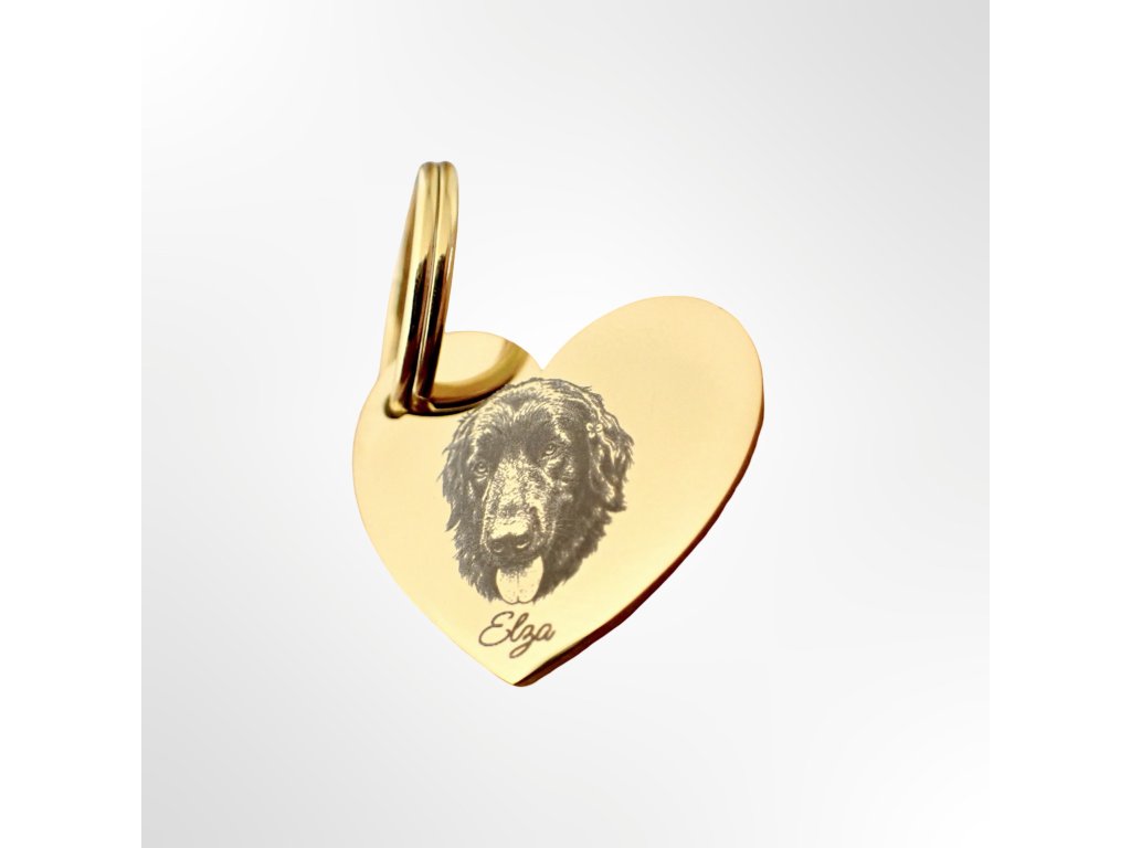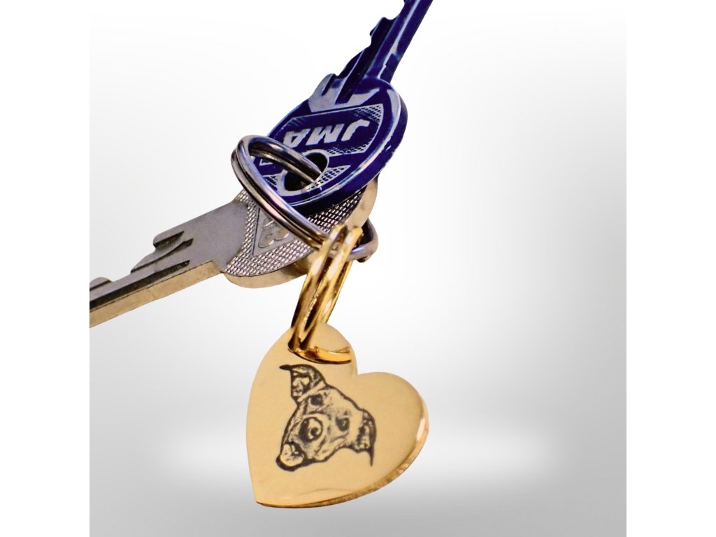 Originální a osobní klíčenka ve tvaru srdce v elegantní zlaté barvě. Tento jedinečný kousek je vyráběn na míru a umožňuje gravírování portrétu vašeho domácího mazlíčka – psa, kočky, králíka, papouška nebo jiného zvířátka. Zákazník jednoduše zašle fotografii, podle které bude vytvořen přesný gravírovaný portrét.