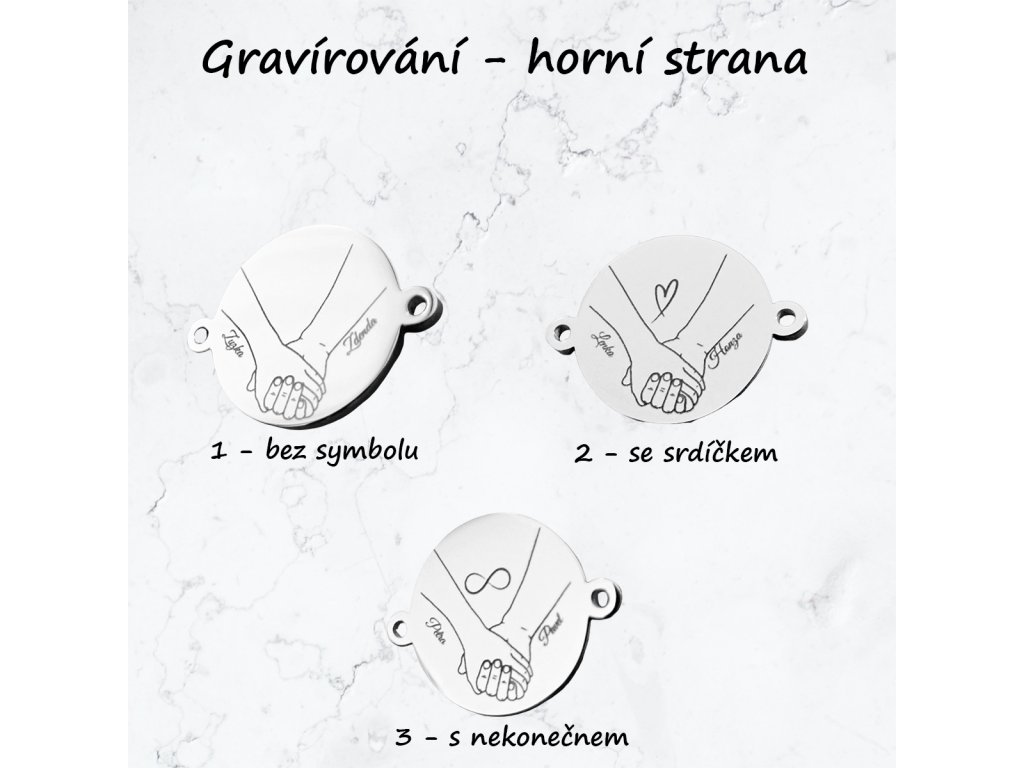 Přívěsek na klíče - gravírované partnerské ruce se jmény (a symbolem) + možnost vlastního textu z druhé strany- stříbrné kolečko