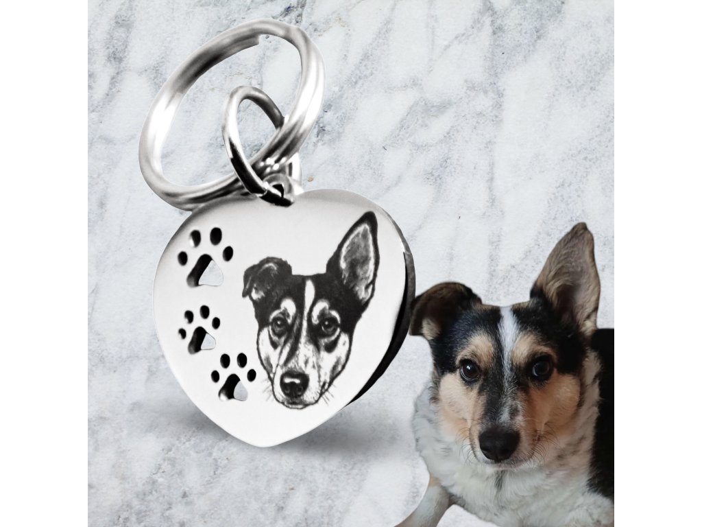 Přívěsek na klíče s portrétem hlavy domácího mazlíčka - stříbrné srdíčko s tlapkami