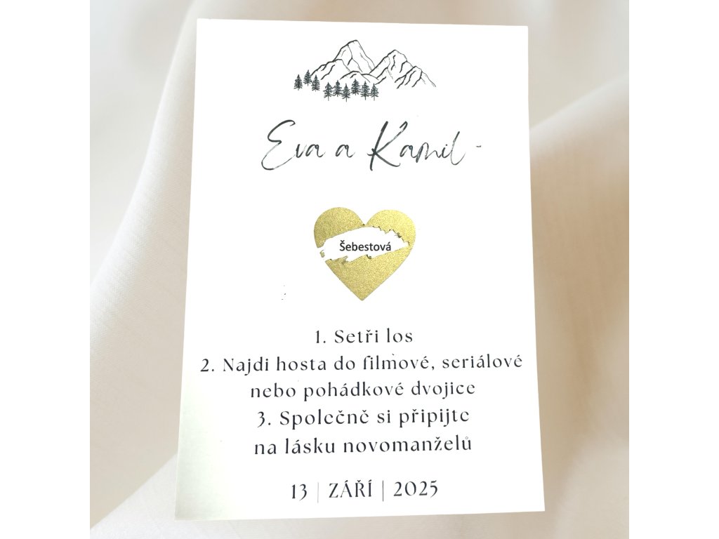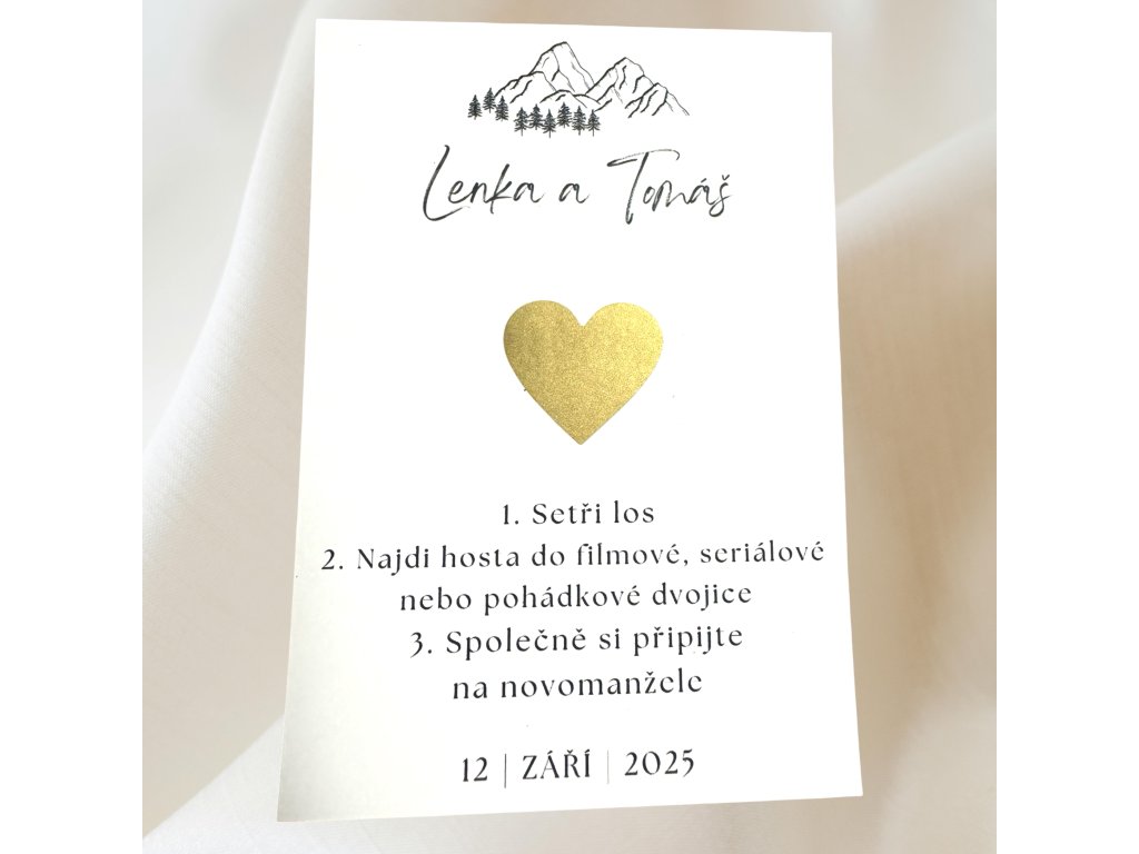 Svatební stírací los - zlaté srdíčko - filmové postavy (hory)