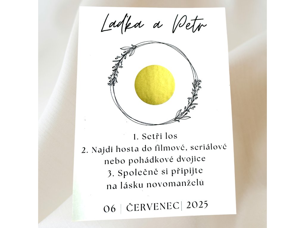 Svatební stírací los - zlaté kolečko - filmové postavy (květinový ornament)