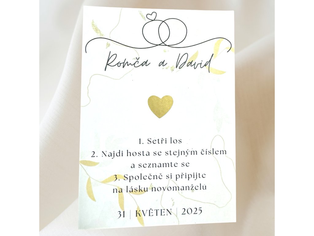 Svatební stírací los - zlaté srdíčko (prstýnky, barva)