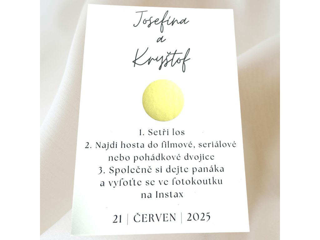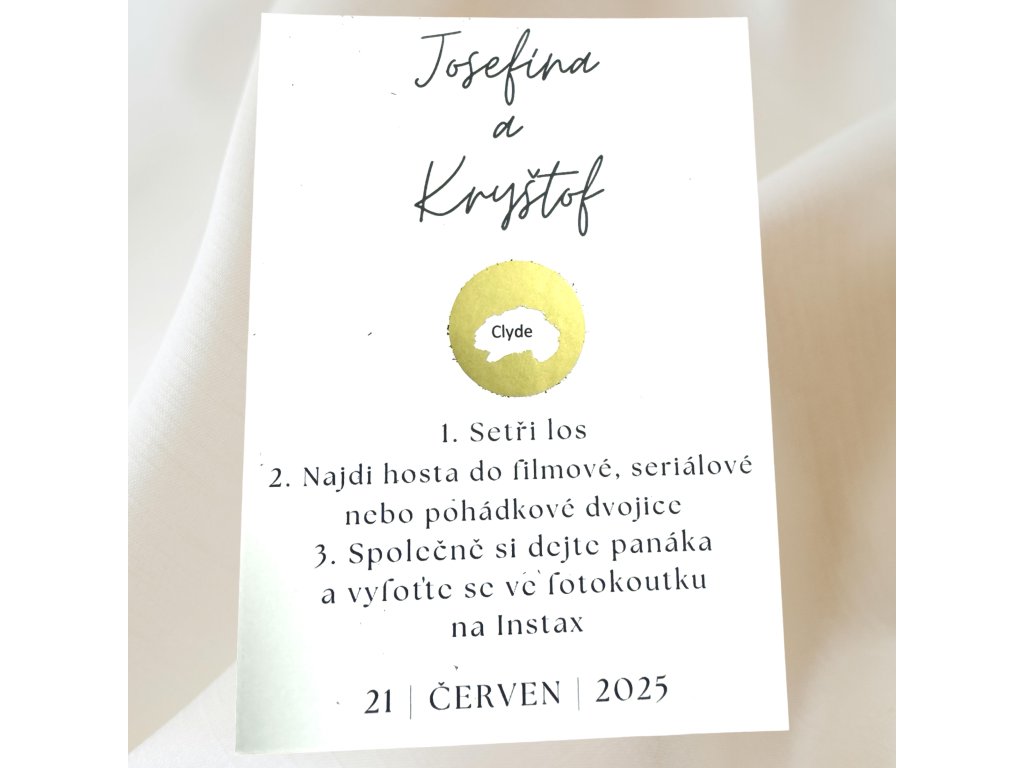 Úkoly můžou být různé, např.: dát si panáka / společně se vyfotit ve fotokoutku / společně si zatančit / vyfotit se na instax a fotku nalepit do svatební knihy,...