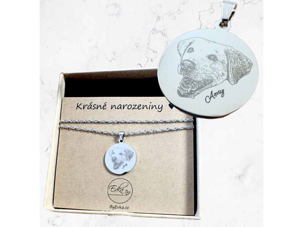 Na přívěsek je možné vygravírovat kromě portréty také jméno zvířátka, datum nebo krátký osobní text. Šperk je dodáván včetně dárkové kartičky s vlastním textem na přání.