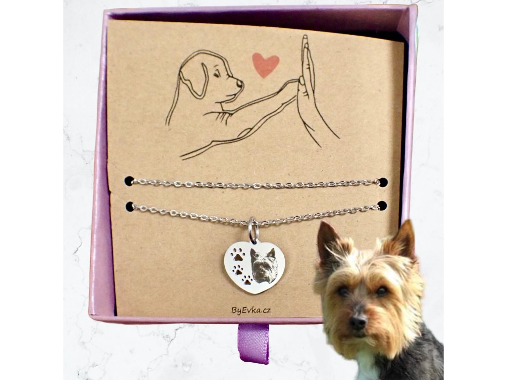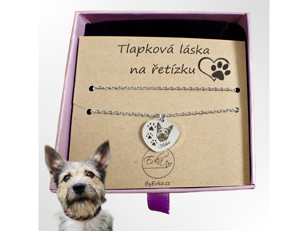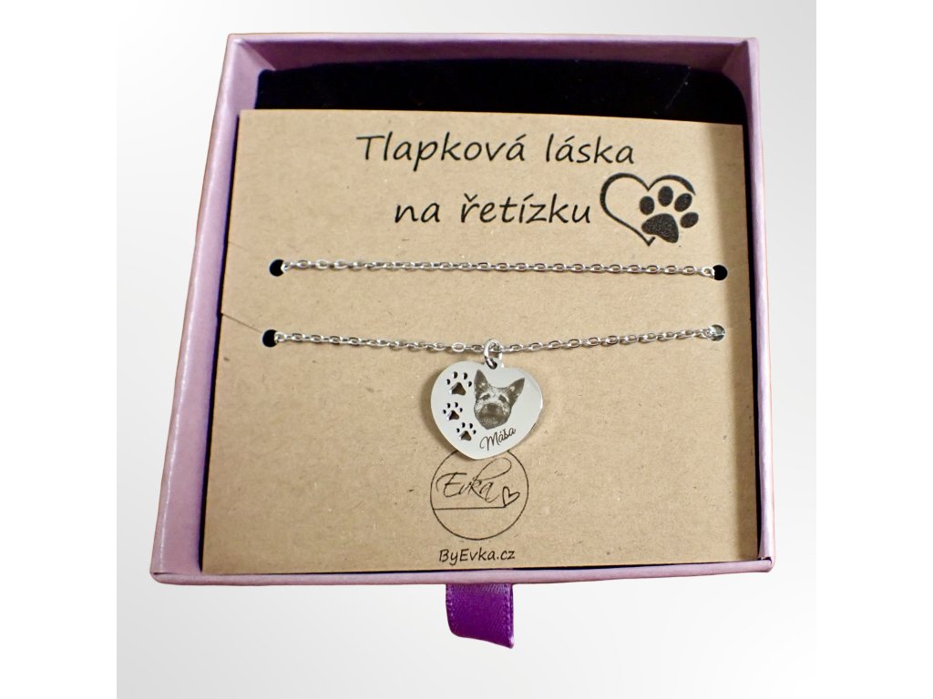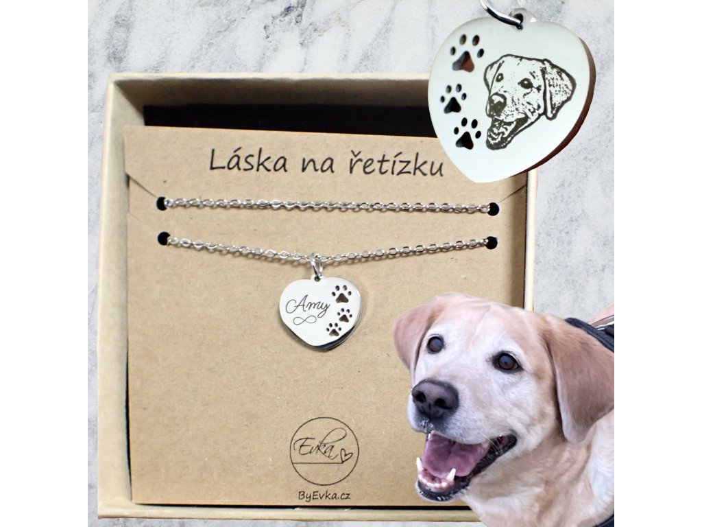 Řetízek s přívěskem – Srdce s tlapkou a gravírovaným portrétem vašeho mazlíčka