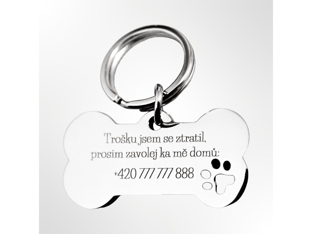 Psí známka ve tvaru kosti s tlapkou – stříbrná (nerezová-chirurgická ocel)
