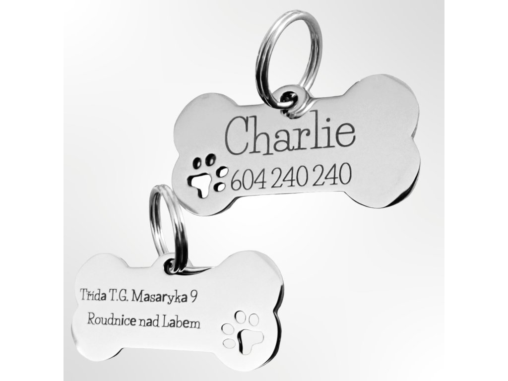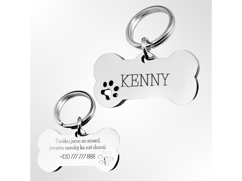 Psí známka ve tvaru kosti s tlapkou - stříbrná