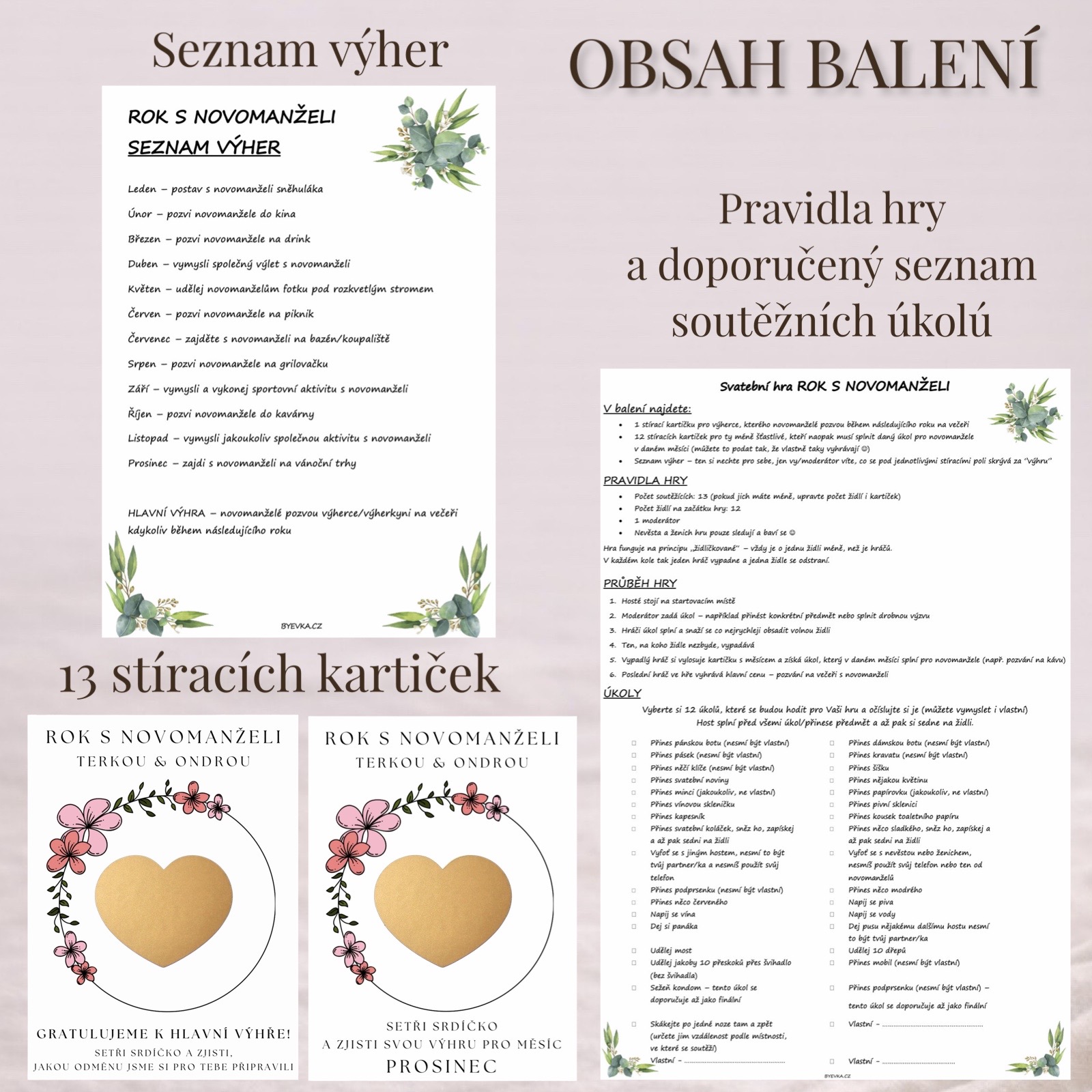 • 12 stíracích kartiček s měsíci (leden-prosinec) - každá skrývá úkol, který musí „méně šťastliví“ hráči splnit pro novomanžele v daném měsíci. (Anebo to můžete podat tak, že vlastně vyhrávají i oni – čeká je společný zážitek s novomanželi.)