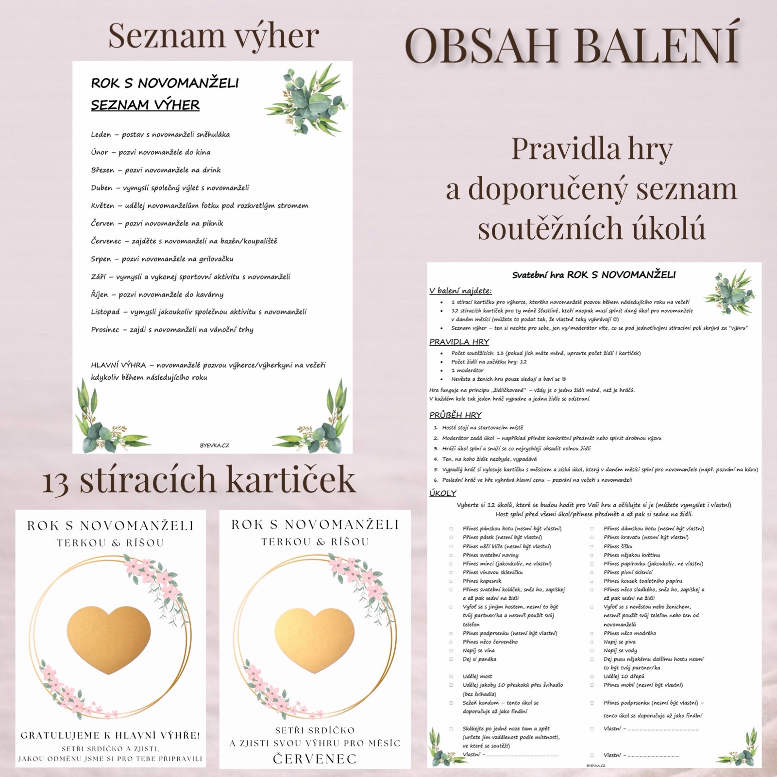 - 12 stíracích kartiček s měsíci (leden-prosinec) - každá skrývá úkol, který musí „méně šťastliví“ hráči splnit pro novomanžele v daném měsíci. (Anebo to můžete podat tak, že vlastně vyhrávají i oni – čeká je společný zážitek s novomanželi.)