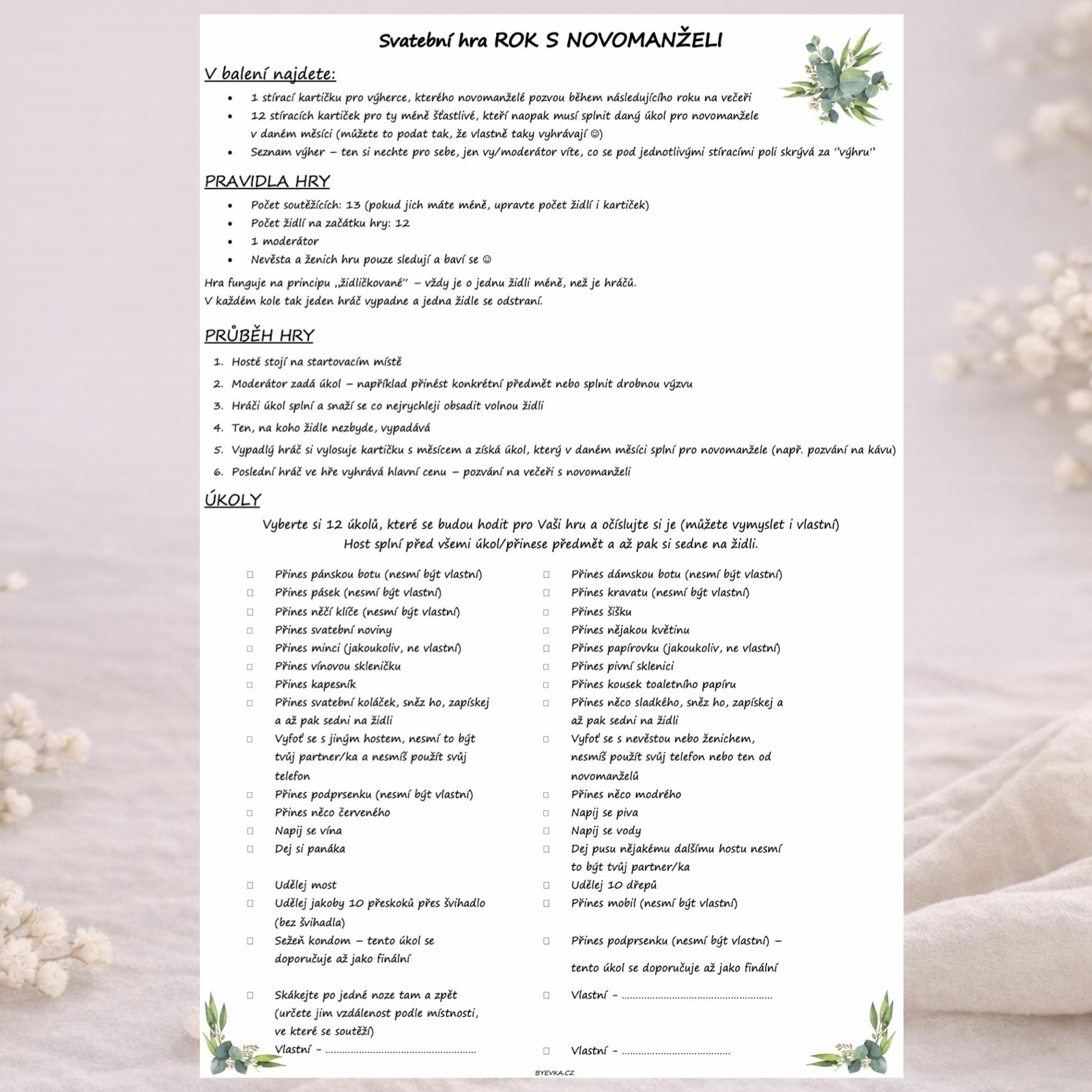 - Vypadlý hráč si vylosuje kartičku s měsícem a získá úkol, který v daném měsíci splní pro novomanžele (např. pozvání na kávu).