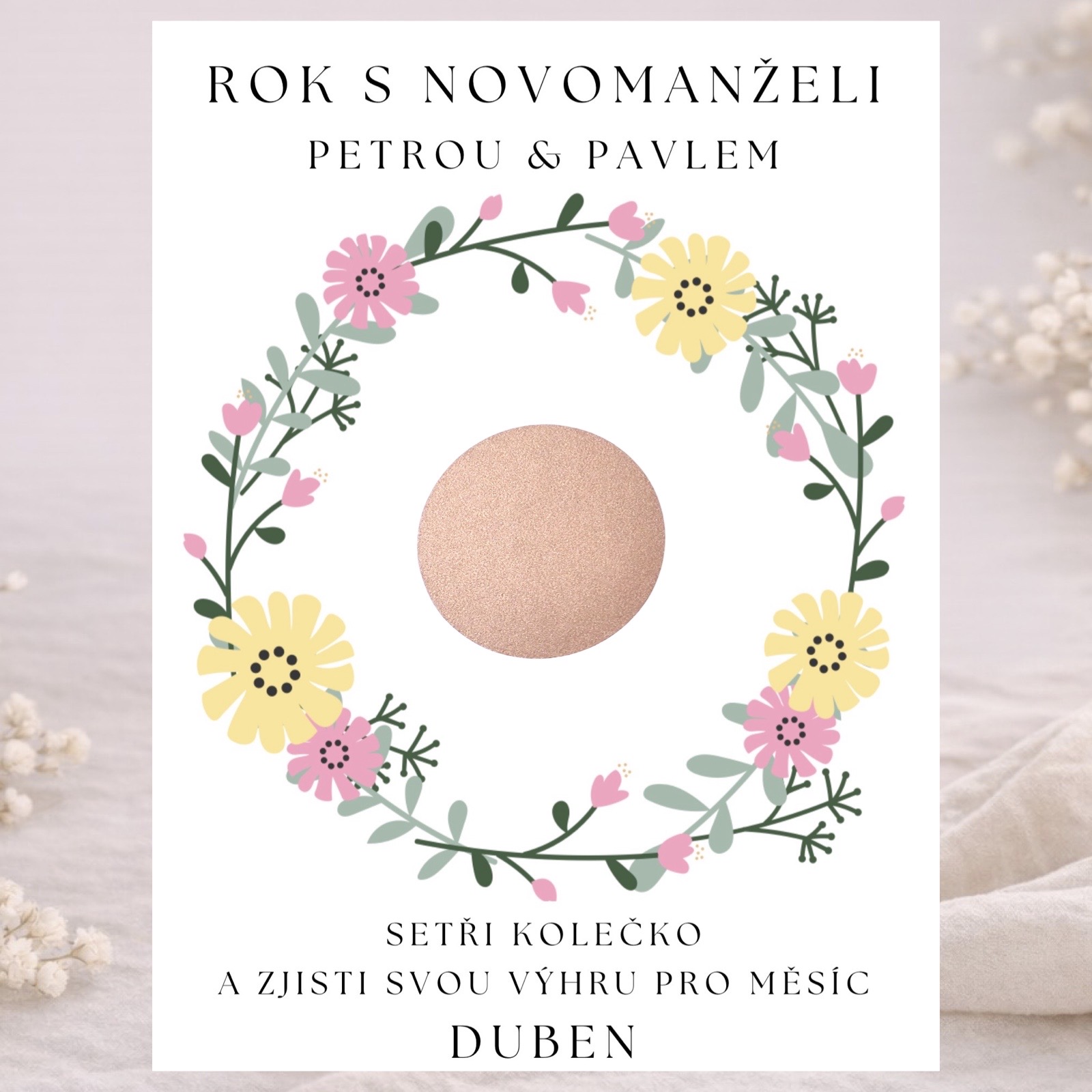 - 1 stírací kartičku pro výherce - výherce si odnese hlavní cenu – během následujícího roku ho novomanželé pozvou na večeři.