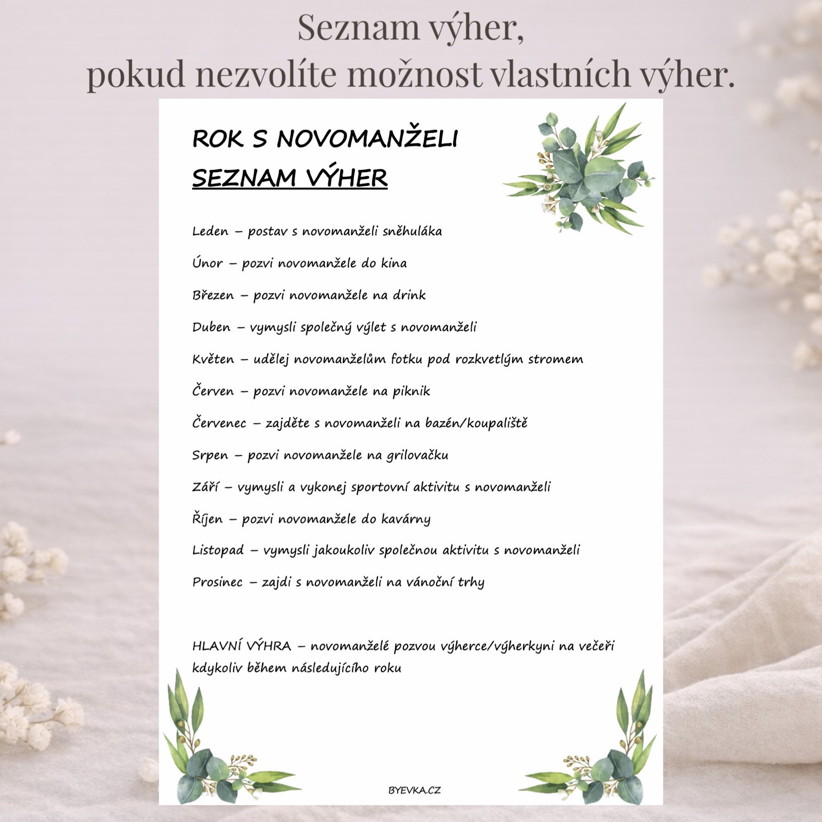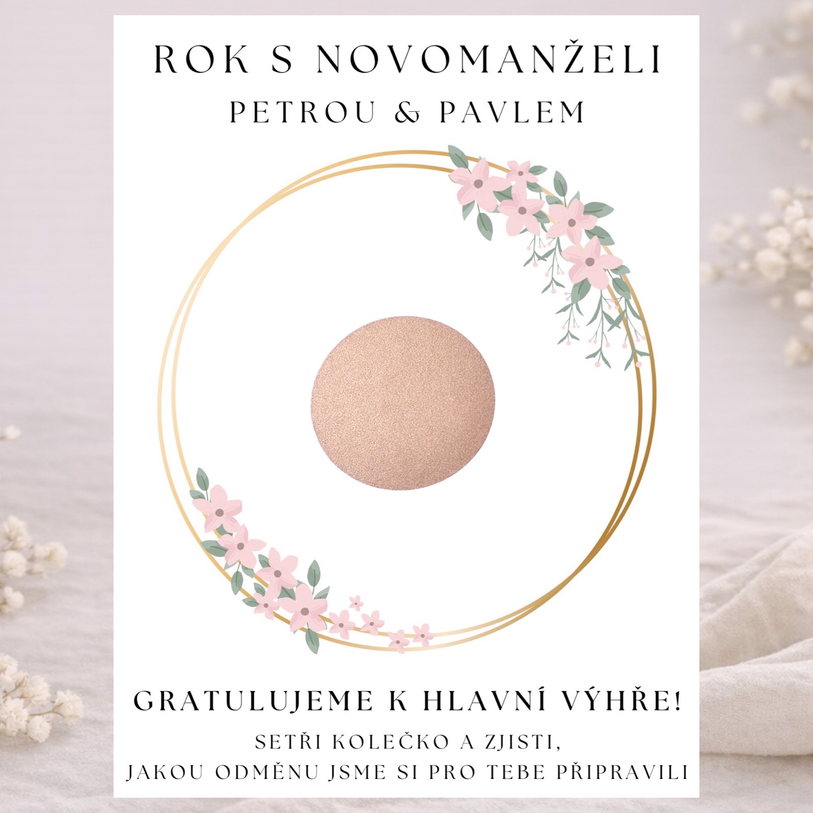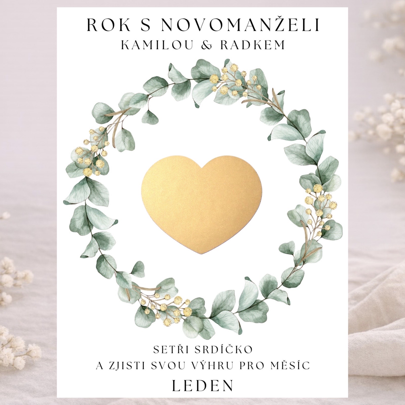 - 1 stírací kartičku pro výherce - výherce si odnese hlavní cenu – během následujícího roku ho novomanželé pozvou na večeři.