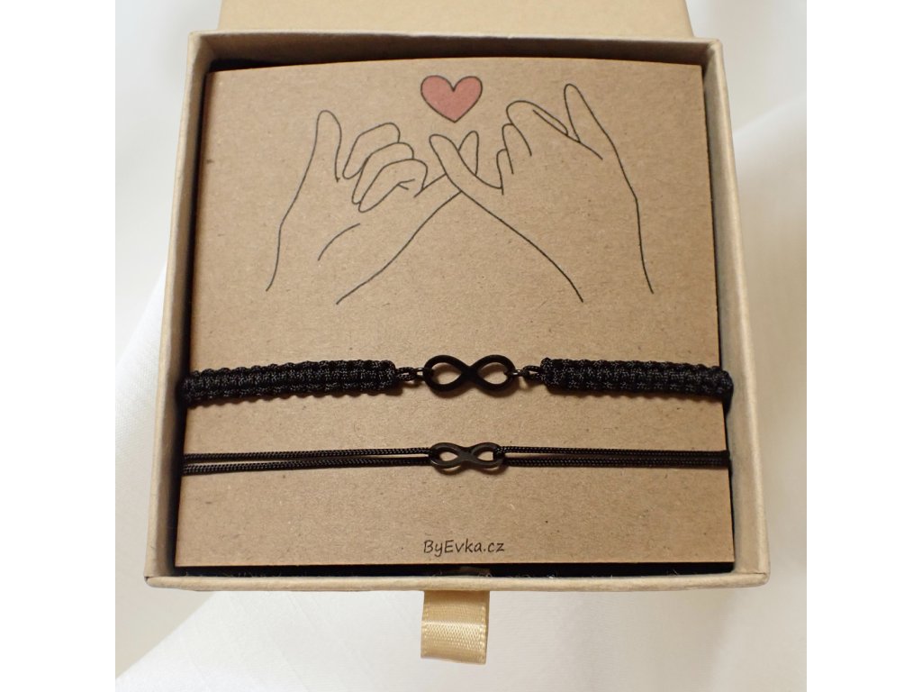 SET se skládá ze 2 náramků s černým nekonečnem z chirurgické oceli - 1x větší v macrame provedení a 1x menší ve šňůrkovém provedení